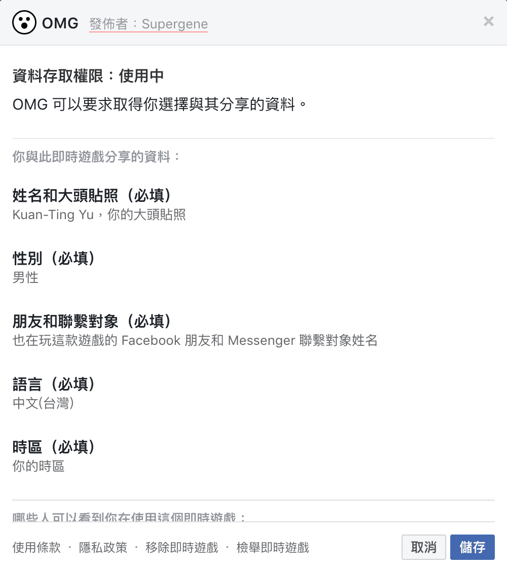 OMG 遊戲可取得的資料。(擷取自 Facebook)